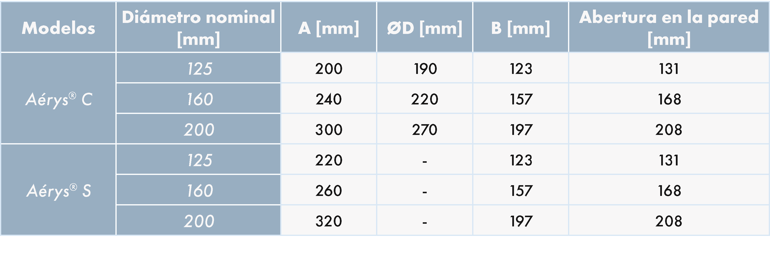 - Hay 3 modelos disponibles para caudales de hasta 400 m³/h, en 4 direcciones: diámetros de 125, 160 y 160 mm.