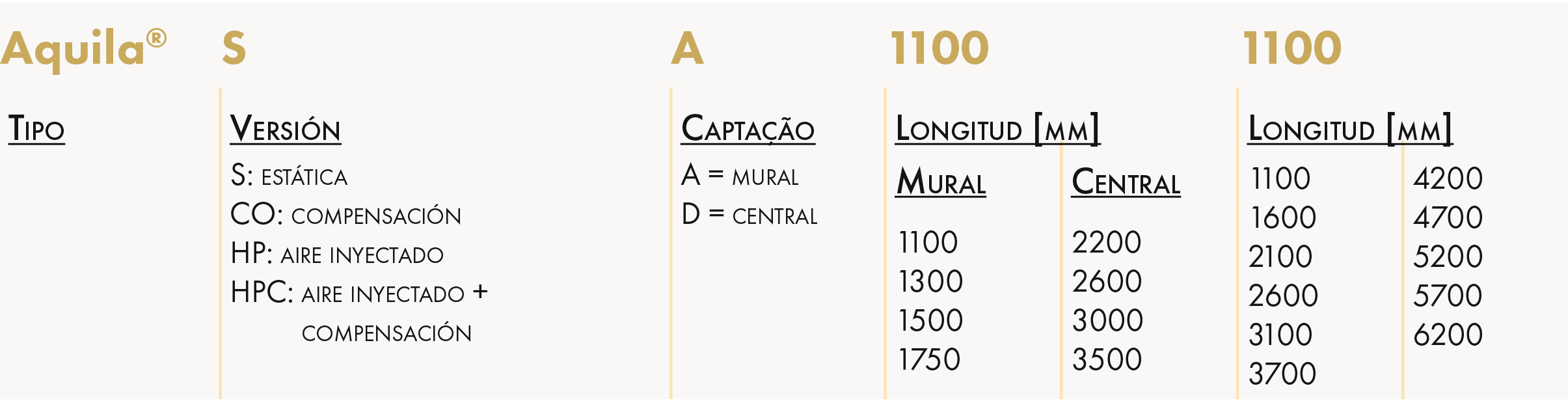 - Campana estática (S), con compensación integrada (CO), con sistema de inyección de aire (HP) y con sistema integrado de inyección+compensación (HPC).