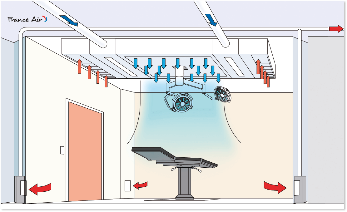 - Techo de flujo unidireccional en el quirófano de riesgo 4 o riesgo 3 según EN ISO 14644-1.