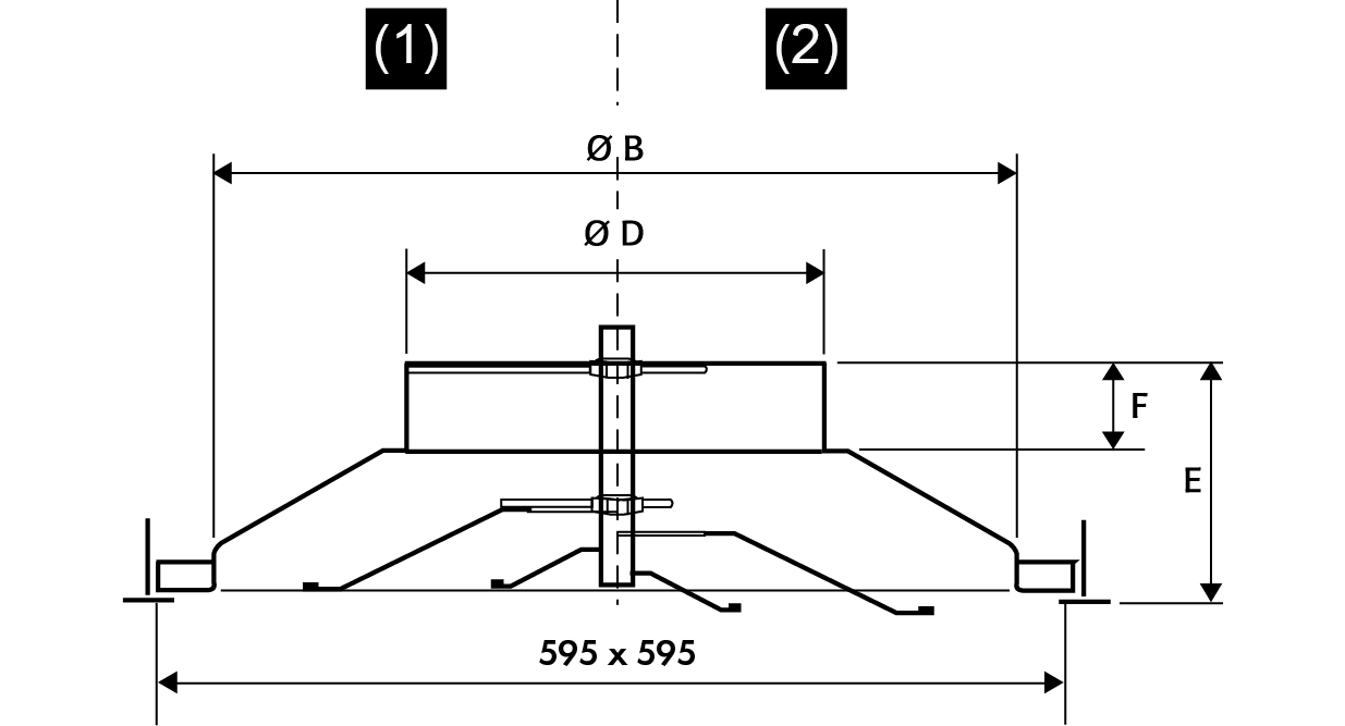- Dimensiones límite de fabricación: Ø 100 mm / Ø 315 mm, en placa de 600 x 600 mm y 675 x 675 mm para falso panel techo .