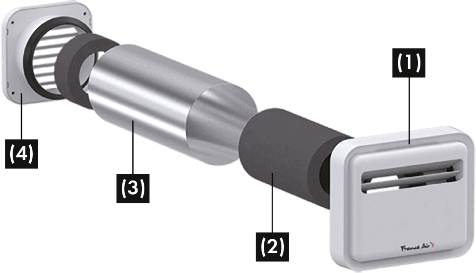 - Toma de aire EM A + adaptación MMM + adaptación acústica MAC 125 + rejilla de fachada GAPM 125 (con espuma).