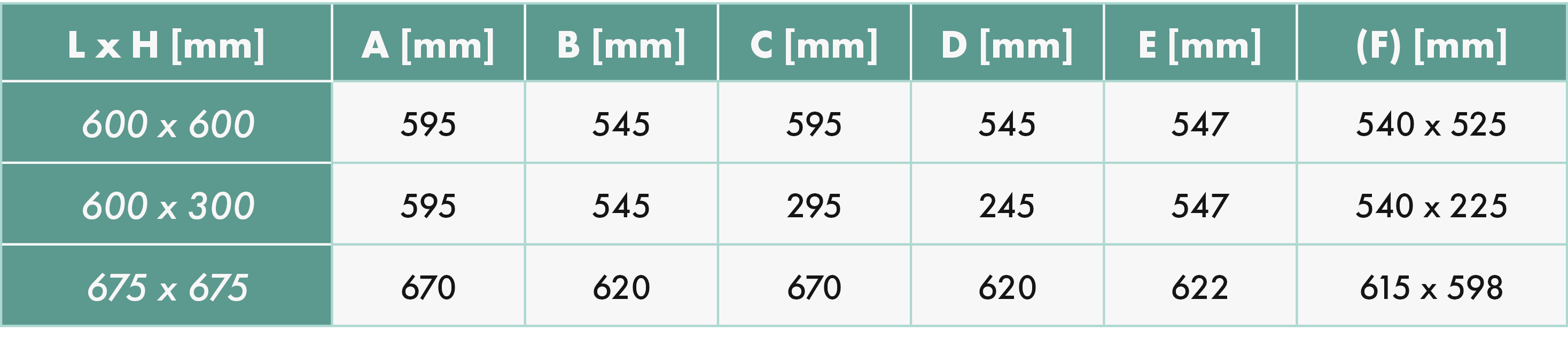 - Dimensiones límite de fabricación: 600 x 300, 600 x 600 y 675 x 675 mm.
