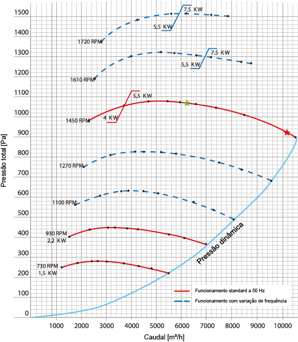 - Rendimientos válidos para aire a 20° C, presión atmosférica y densidad del aire de 1,2 kg/m³.