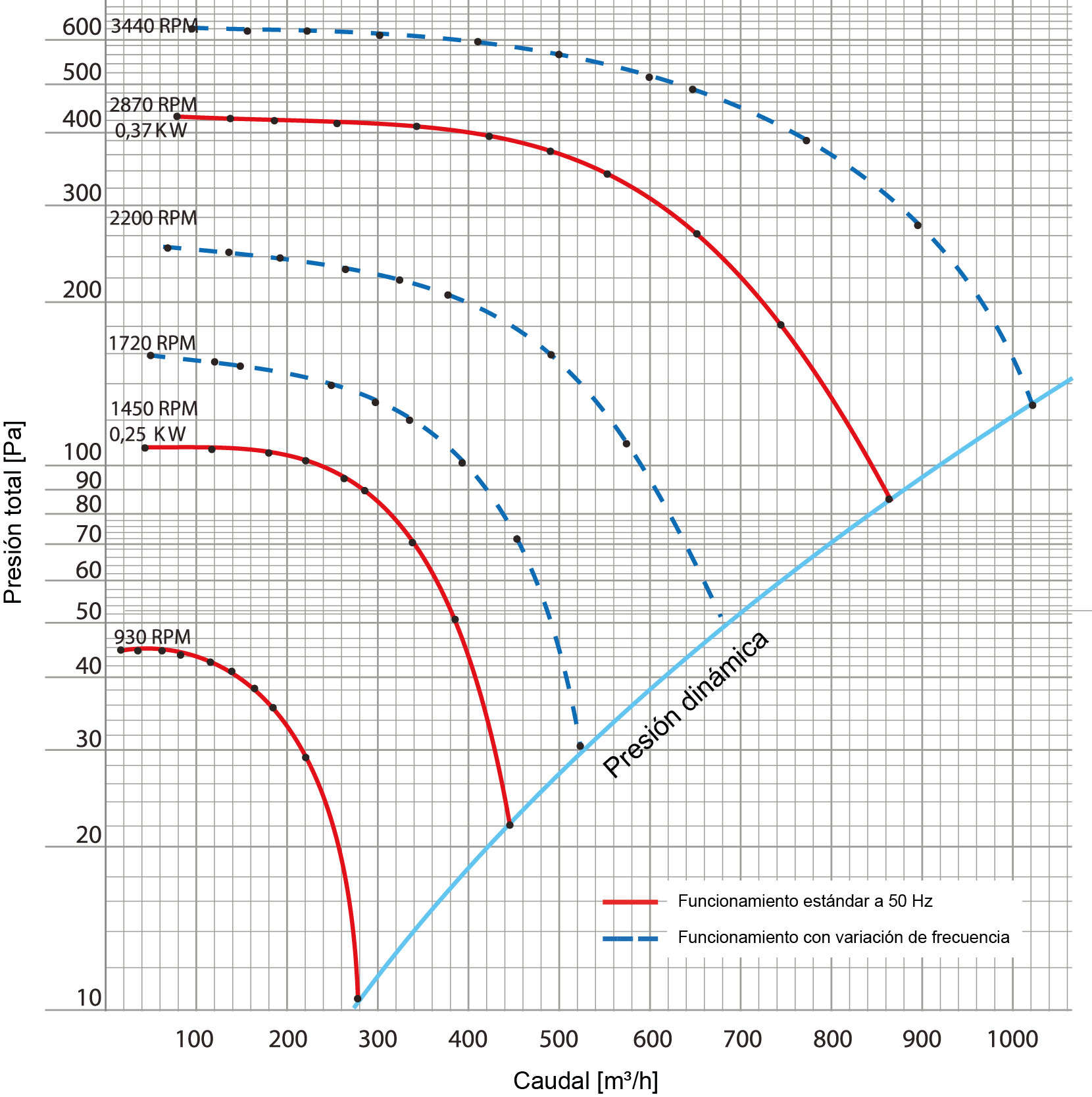 - Funcionamientos válidos para aire a 20° C, a presión atmosférica y una densidad del aire de 1,2 kg/m³.