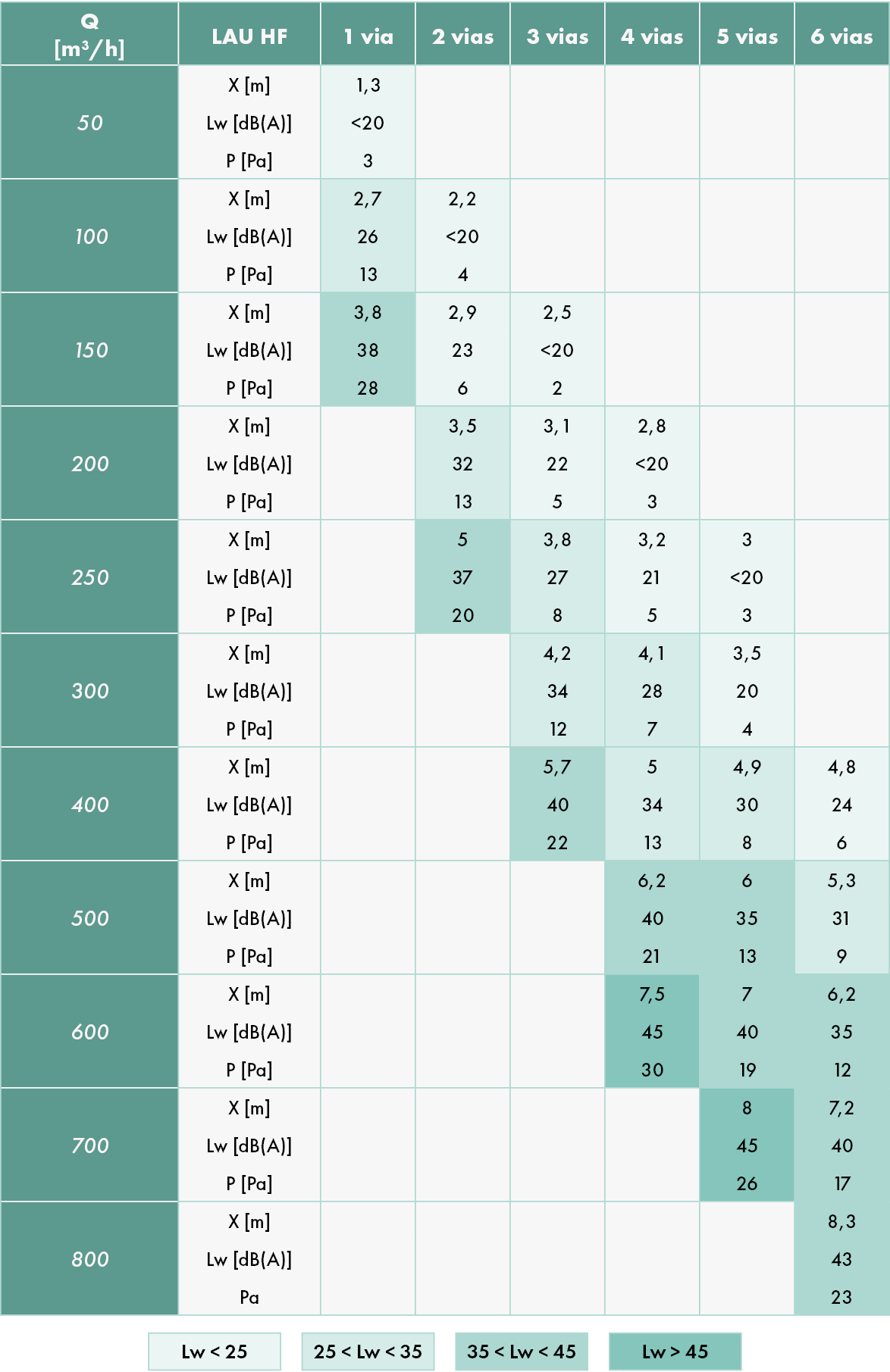 Lw: potencia acústica sin atenuación local [dB (A)]; P: pérdida de carga [Pa]. Ensayo en condiciones isotérmicas.