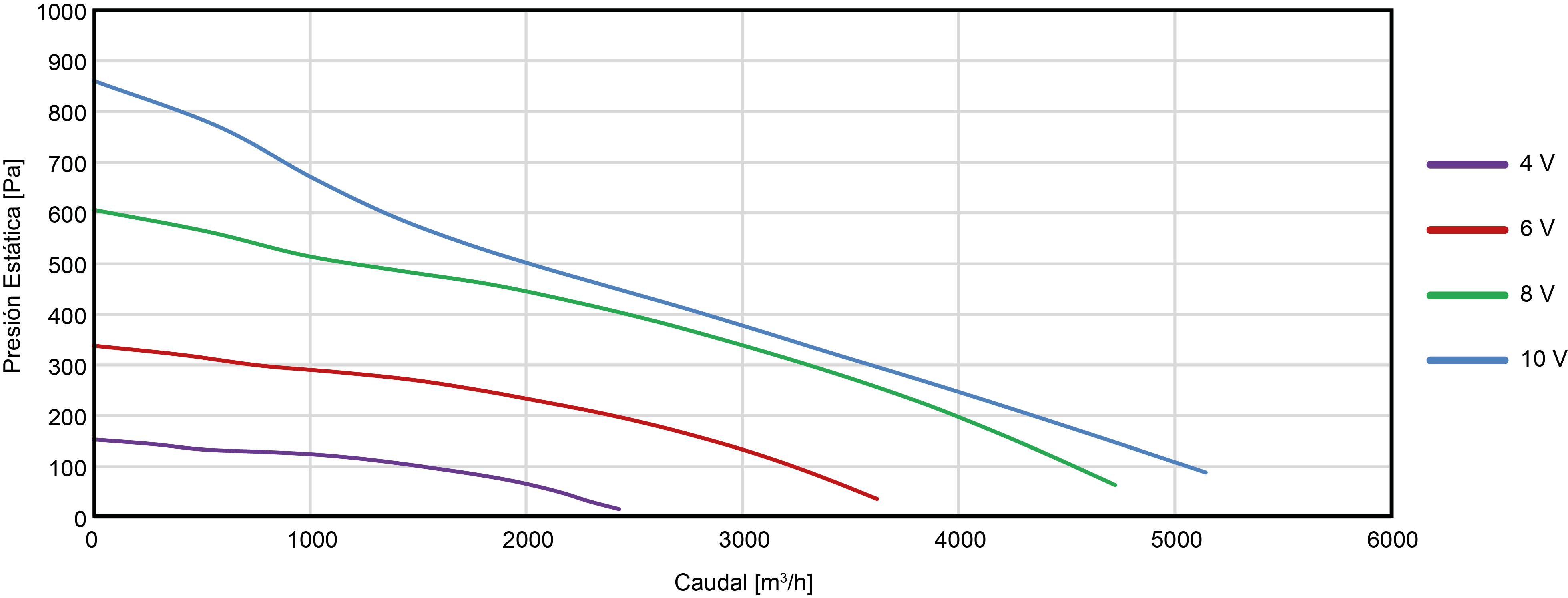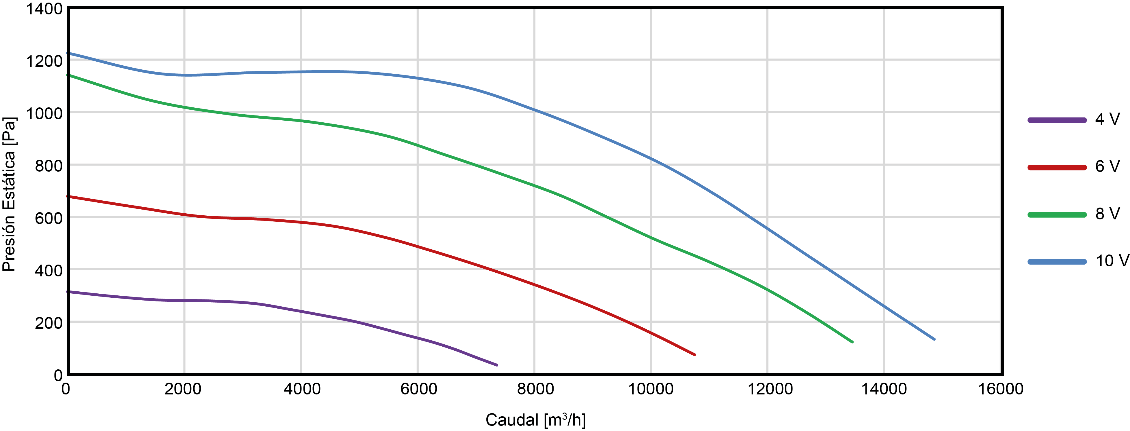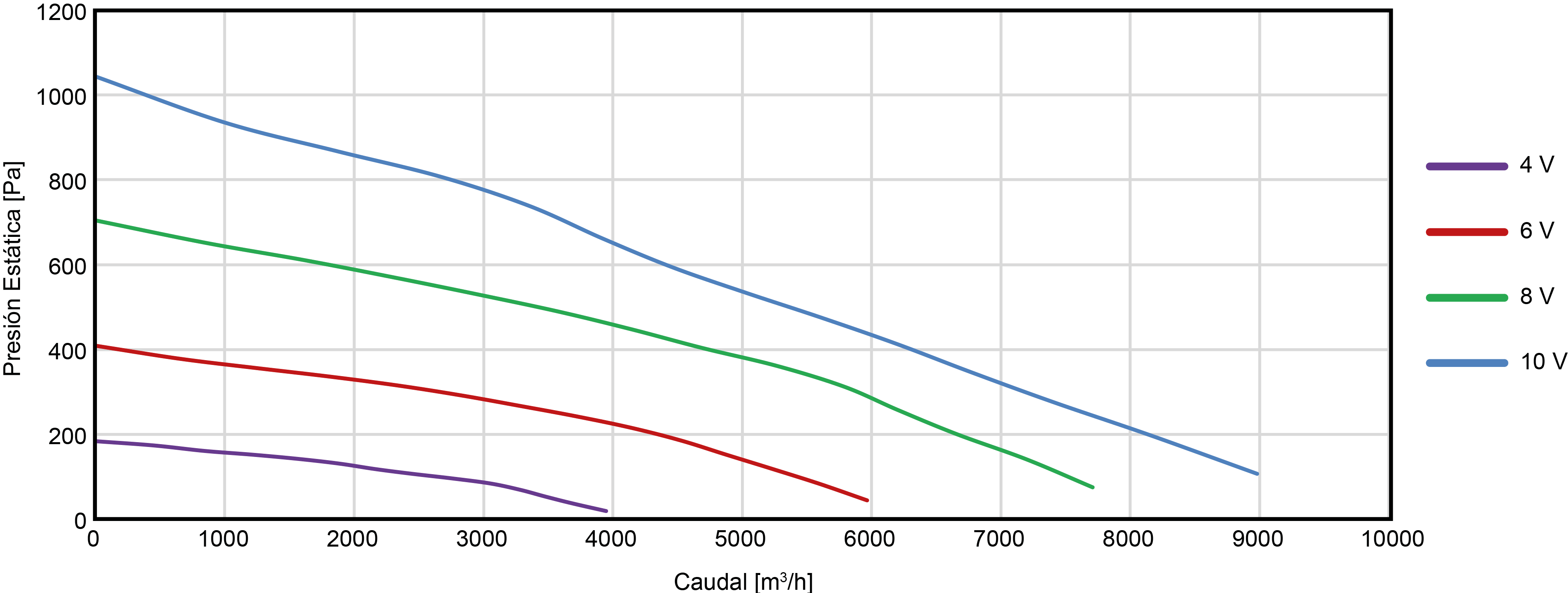 - Motor EC integrado (conmutación electrónica) de alta eficiencia y bajo consumo, monofásico o trifásico, con rotor externo acoplado directamente, control de señal 0-10 Vdc.