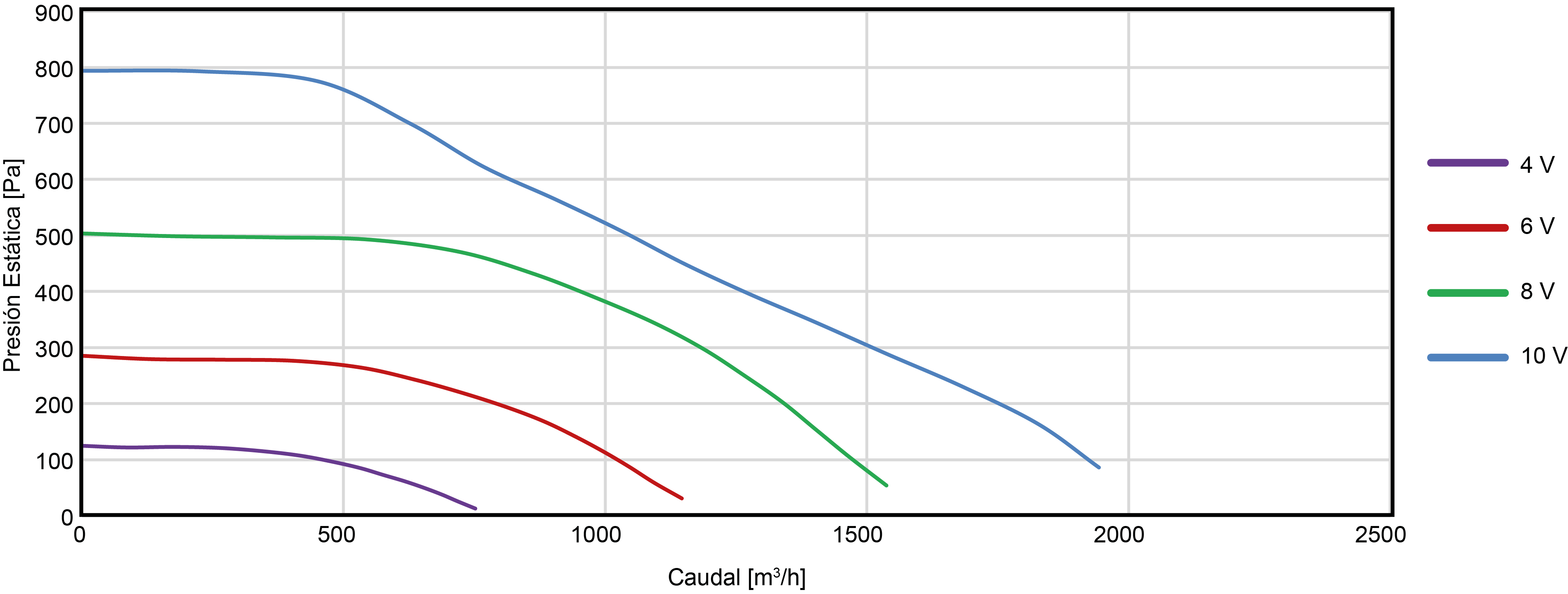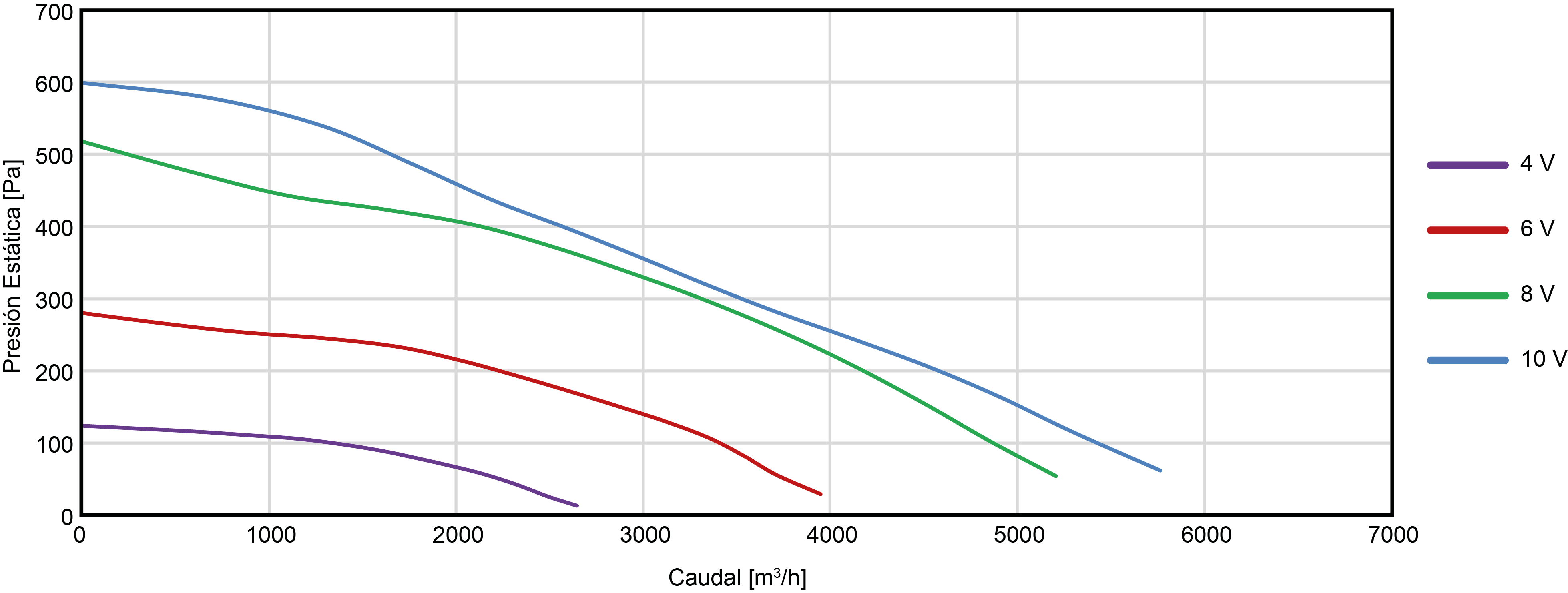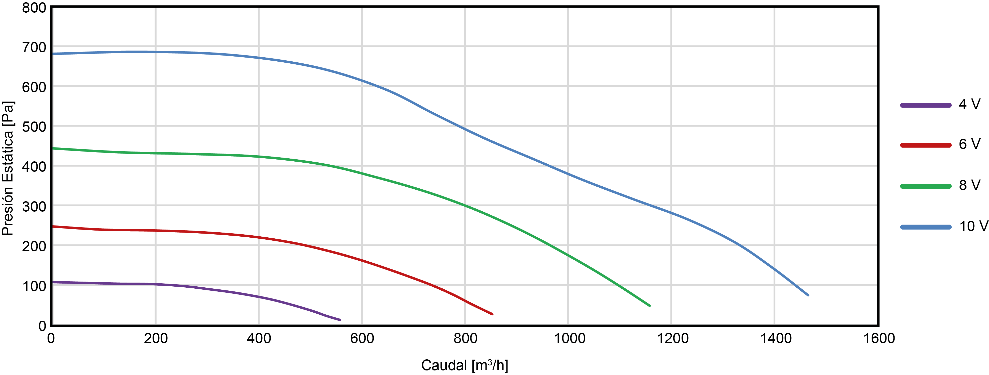 - Motor EC integrado (conmutación electrónica) de alta eficiencia y bajo consumo, monofásico o trifásico, con rotor externo acoplado directamente, control de señal 0-10 Vdc.