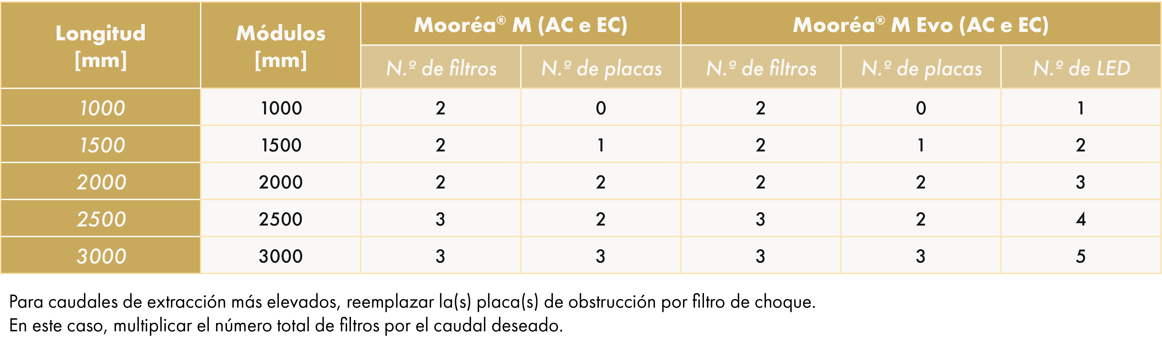 - Mooréa® M Evo EC o AC:Plug&Play (Evo); motor de ventilador de extracción integrado; con motor estándar (AC) o motor de bajo consumo (EC); control integrado en la visera y fuente de iluminación LED; disponible con control remoto con control por solenoide de gas.