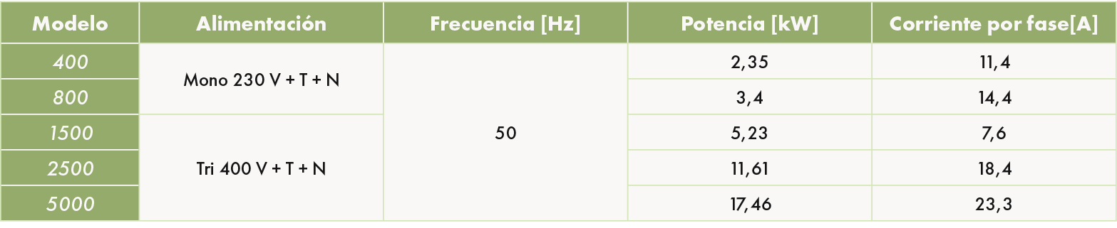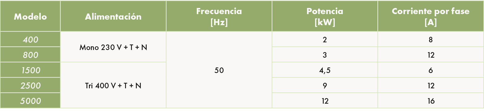 - La Power Box® Up se suministra con una caja de conexiones eléctricas con las características descritas en las tablas siguientes, según el modelo.