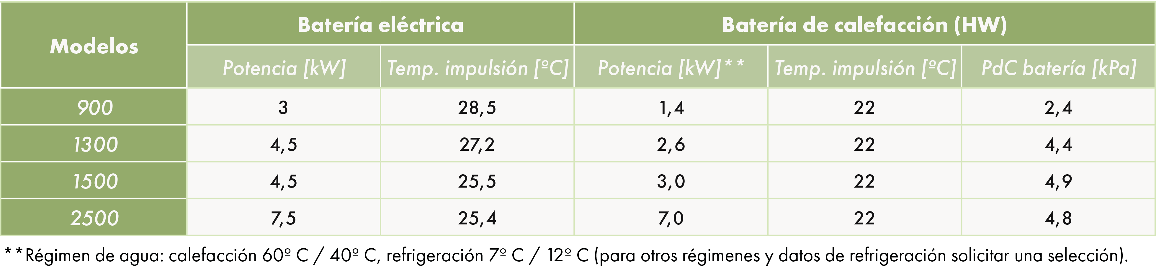 - Pérdida de carga adicional: filtro F7 + 70 Pa; batería de agua caliente + 25 Pa.