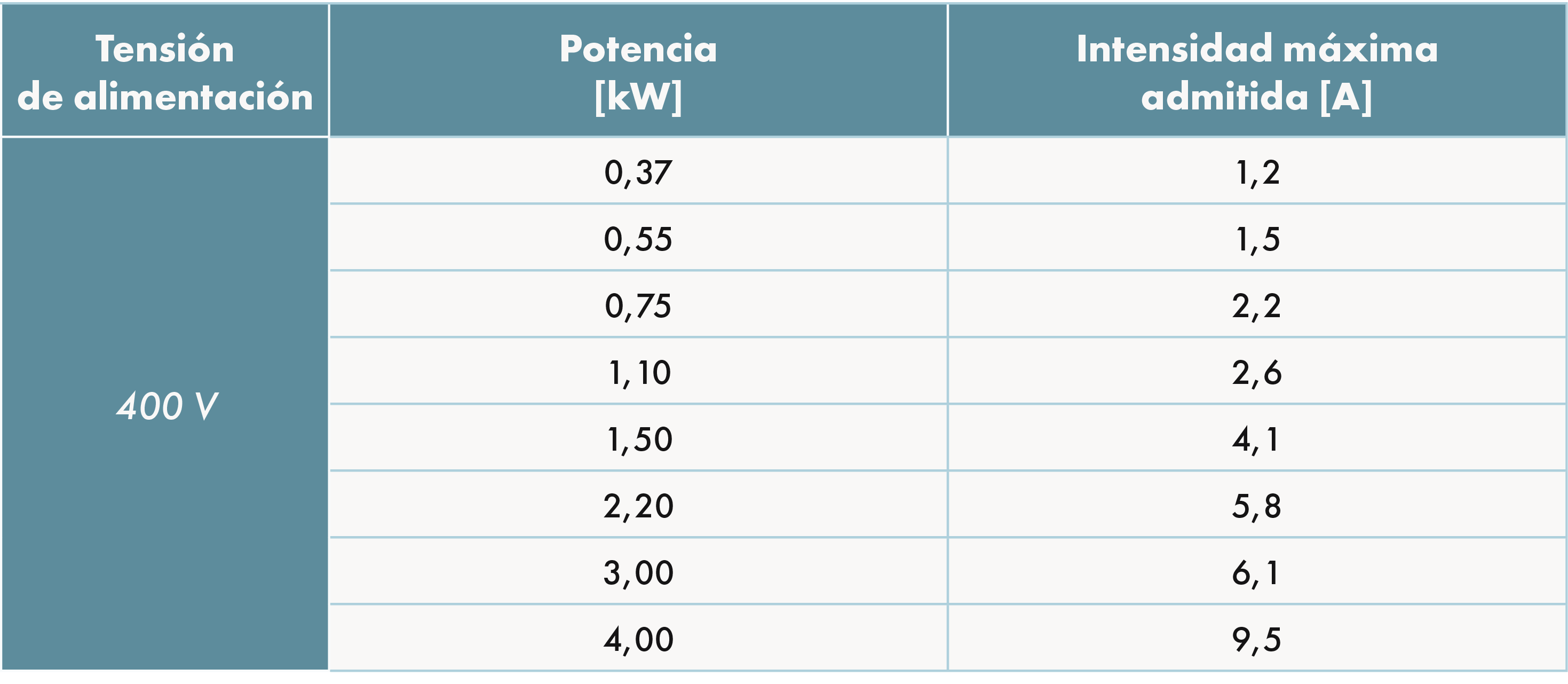 - Tensión de red trifásica 400 V, 50 Hz (sin neutro).