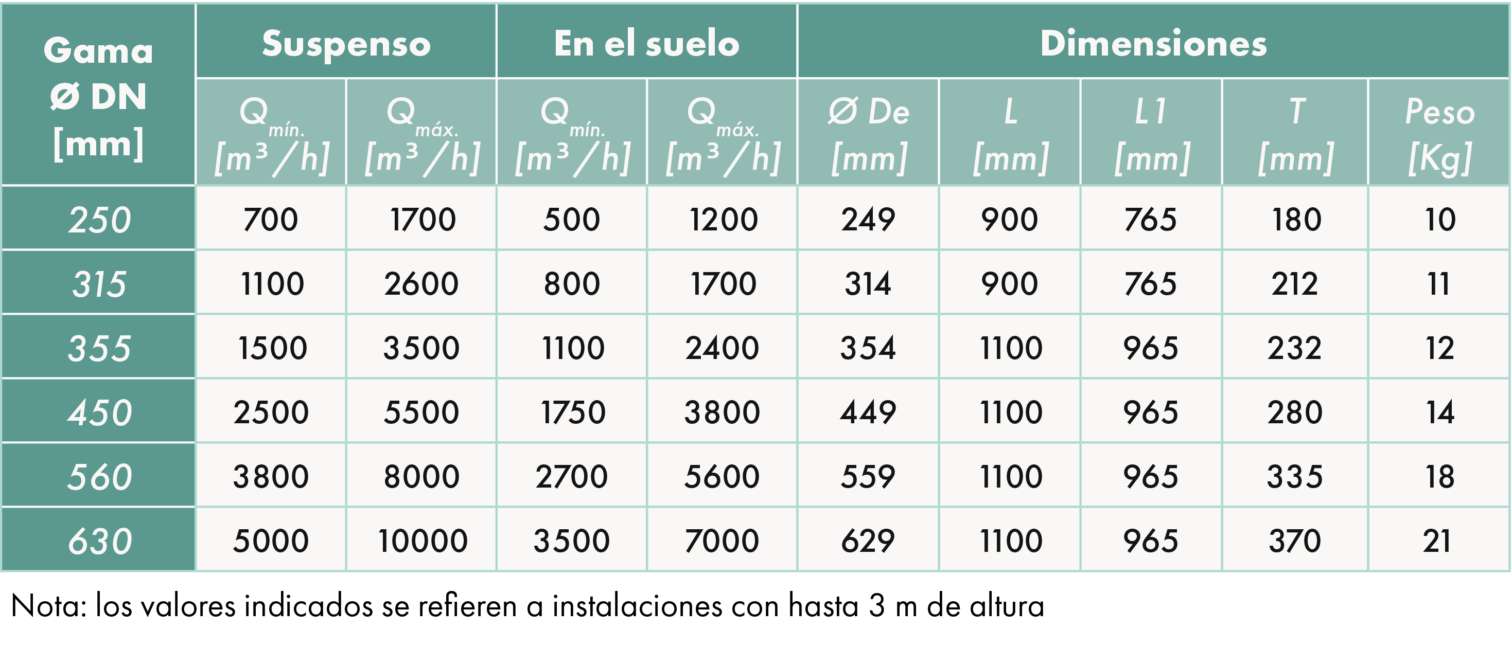 - Hasta 7000 m³/h para el modelo montado en el suelo y hasta 10000 m³/h para los modelos suspendidos.