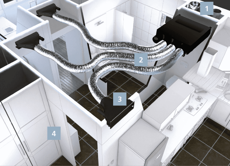 2. La red de conductos PhoniFlex® distribuye el aire recalentado en las distintas estancias a tratar.