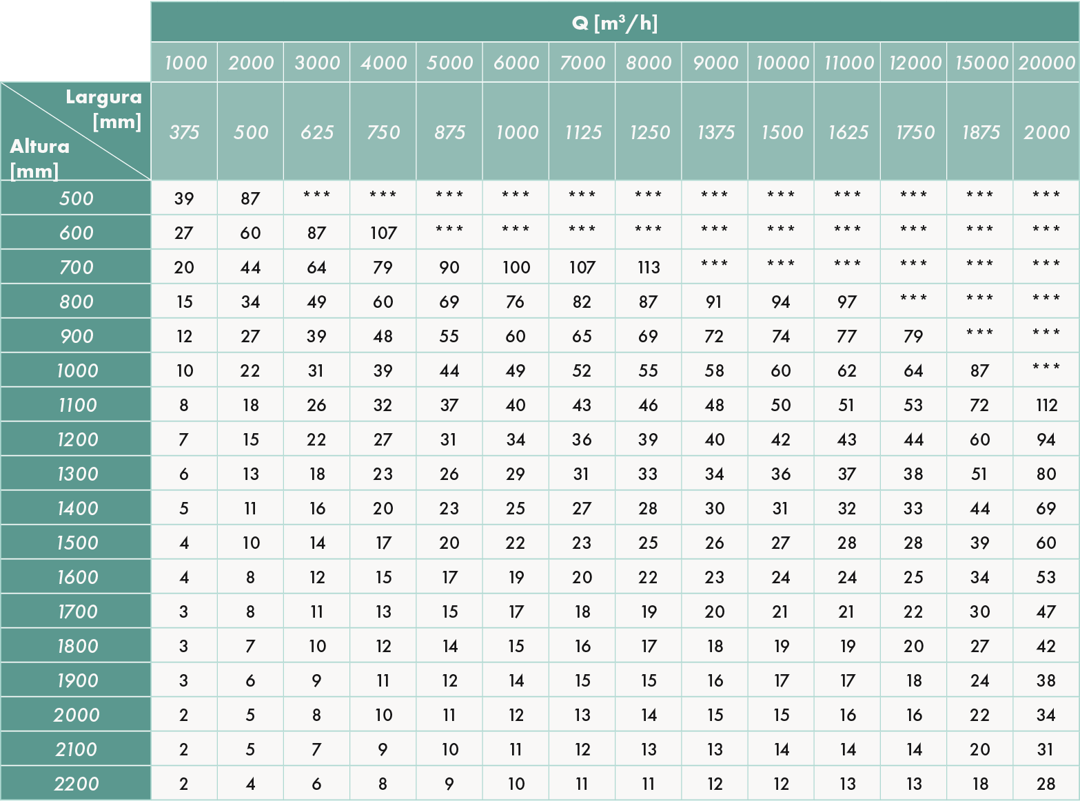 *** Velocidade de passagem do ar na grelha superior a 3 m/s e perda de carga superior a 120 Pa - dimensionamento não preconizado.