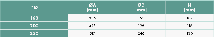 - Dimensões limite de fabrico: 160, 200 e 250 mm.