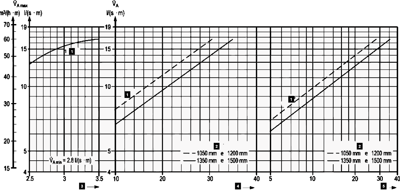 - Caudais indicativos de 60 até 400 m³/(h.m) para IN-V2 e 40 até 60 m³/(h.m) para IN-V3 (tabelas de seleção).