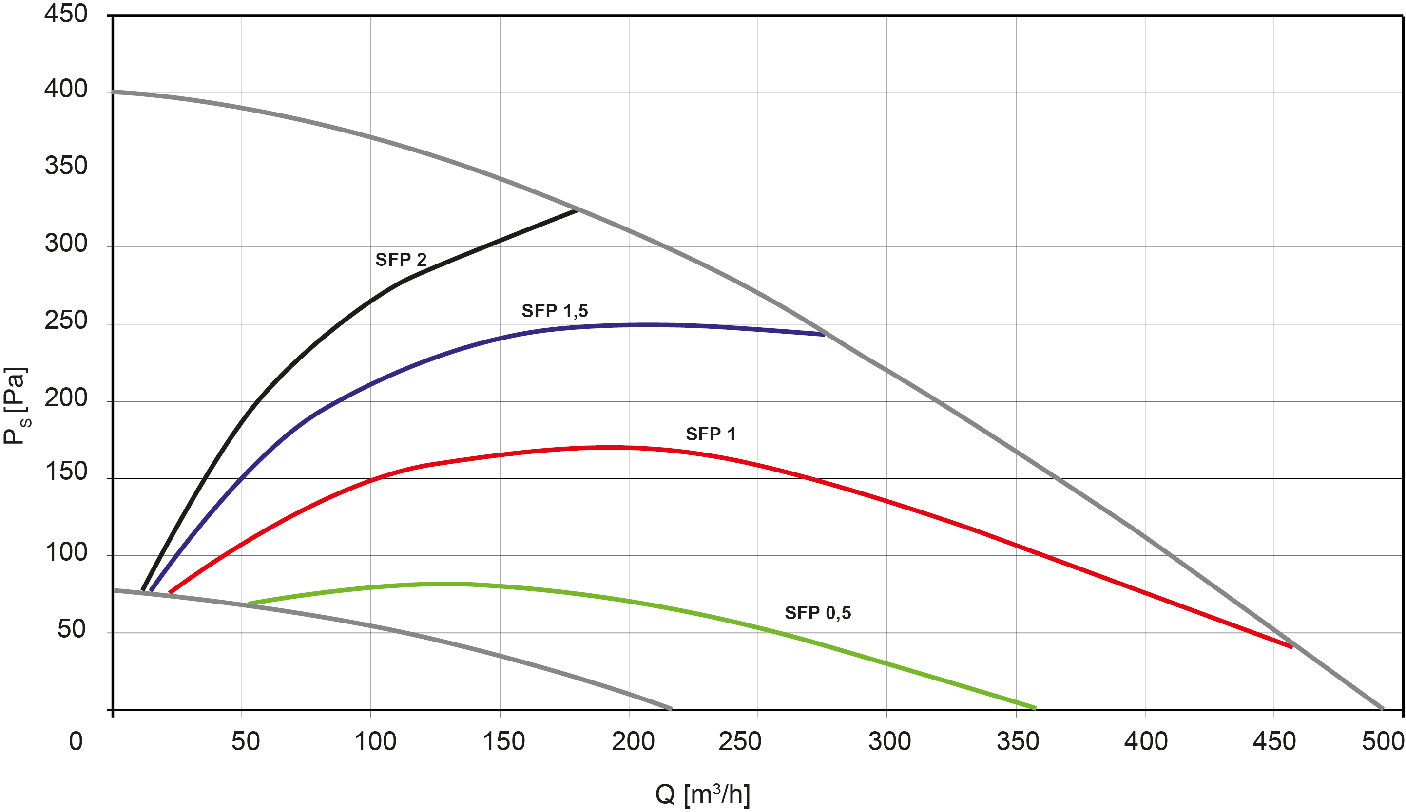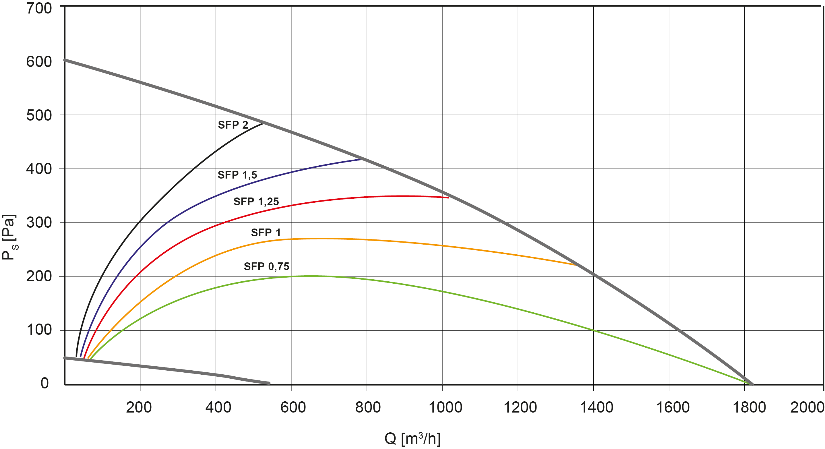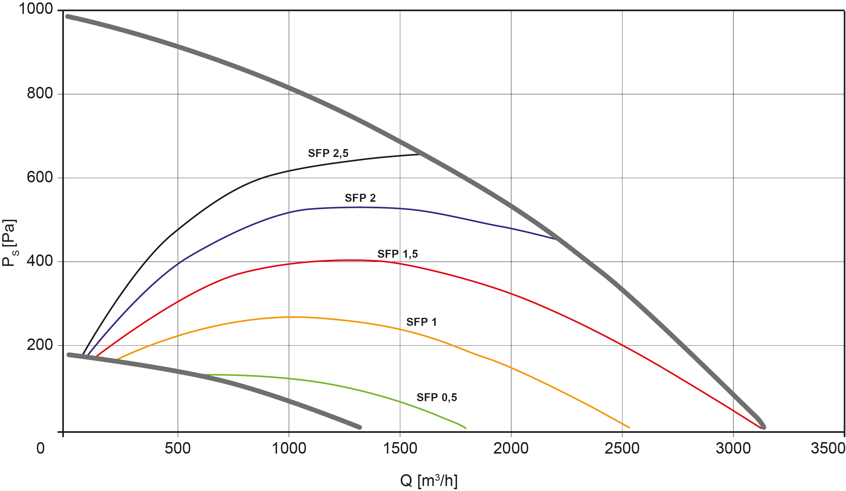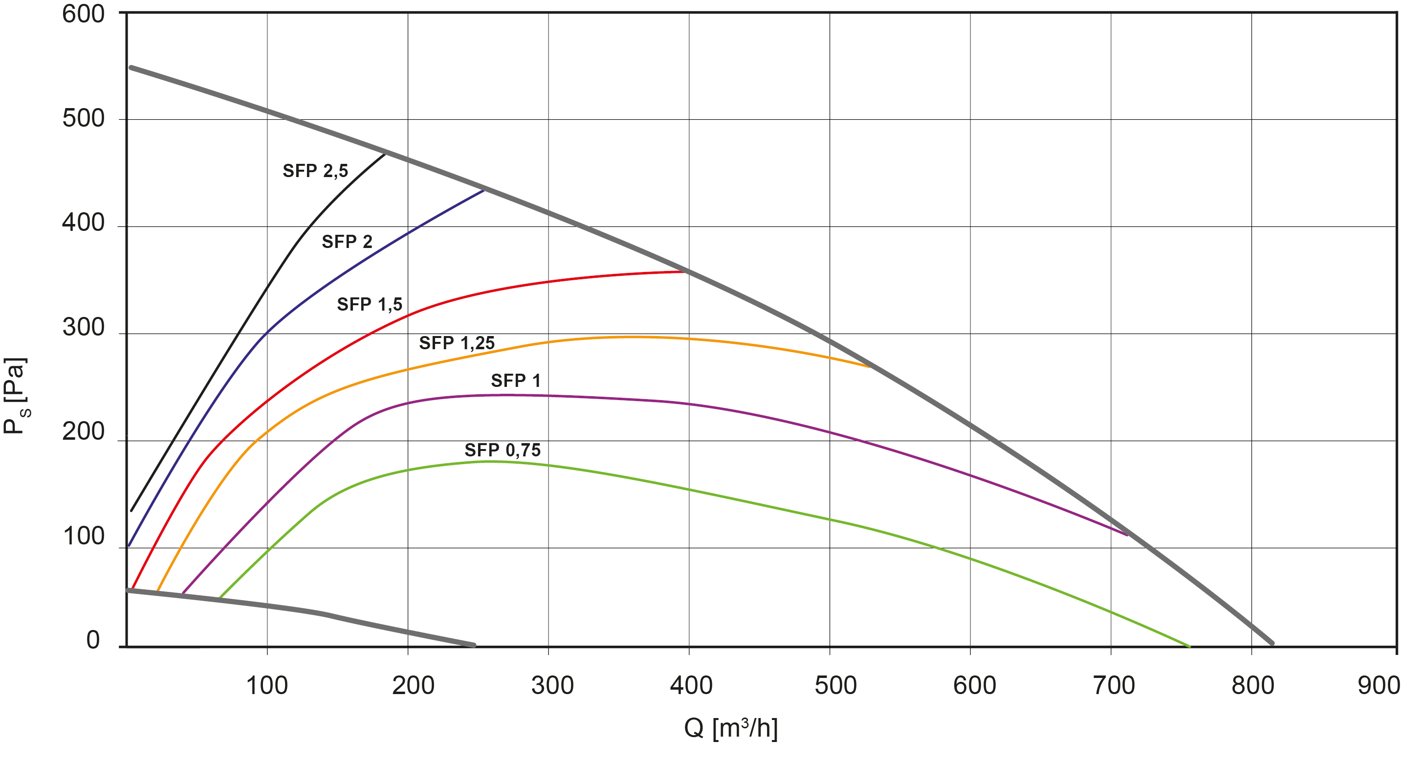 - As curvas são realizadas com um filtro F7 na insuflação e G4 no retorno. O coeficiente SFP define a potência específica do ventilador em kW por m³/s.