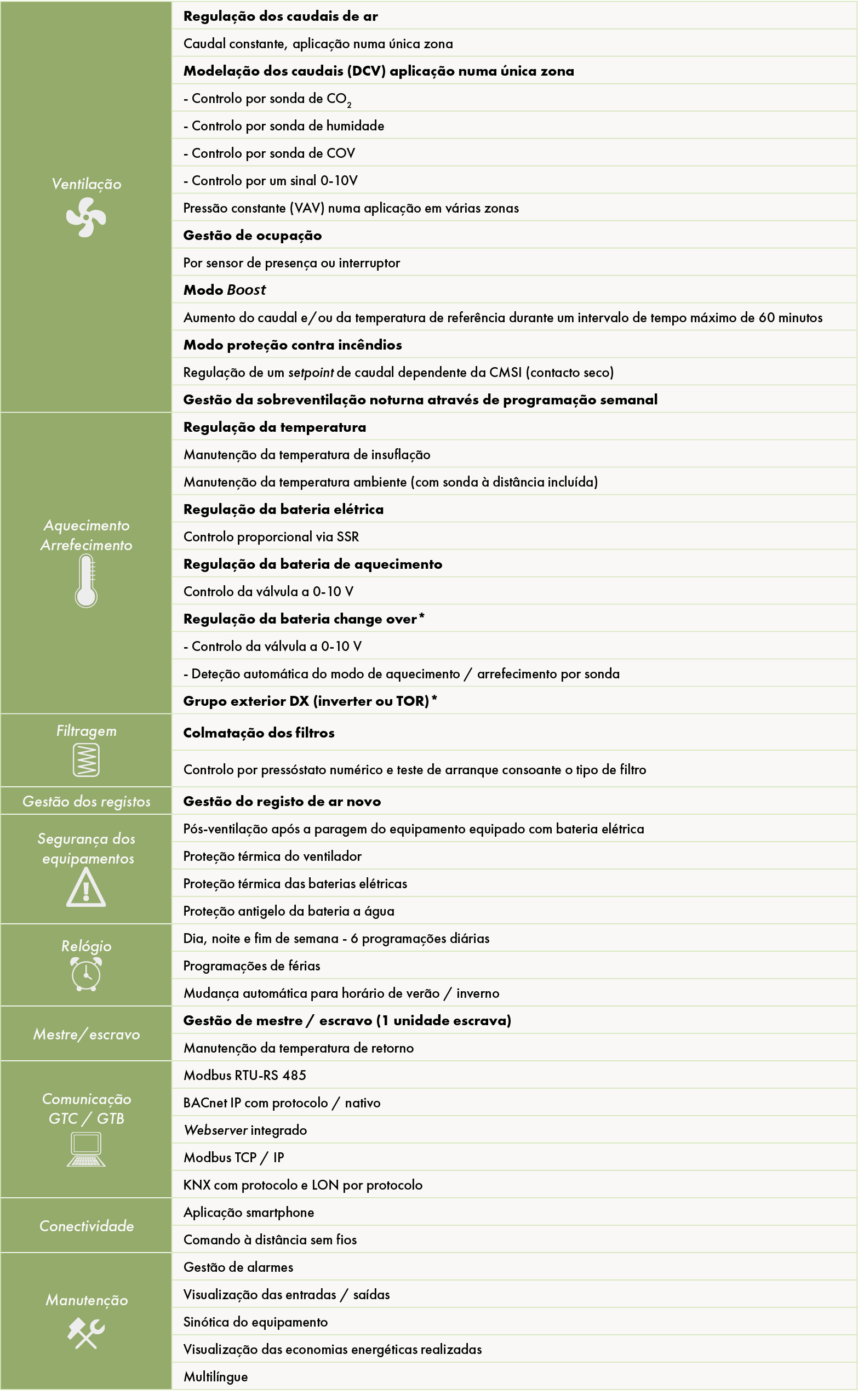 - Ventilação, filtragem e pré-aquecimento do ar novo com sistema de regulação automática para espaços do setor terciário e cozinhas.