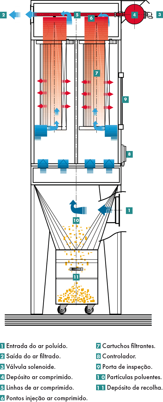 - A filtragem é feita em dois estágios: O primeiro, por gravidade devido ao efeito da expansão brusca existente na entrada do filtro, promovendo a queda e recolha das poeiras no fundo do filtro, sendo encaminhadas para o depósito ou sistema de recolha automático. O segundo, pela passagem do ar pelas paredes dos cartuchos filtrantes cilíndricos, selecionados em função da natureza dos poluentes sendo os mais usuais: poliéster com revestimento de teflon, alumínio anti estático, carvão ativado, entre outros.
